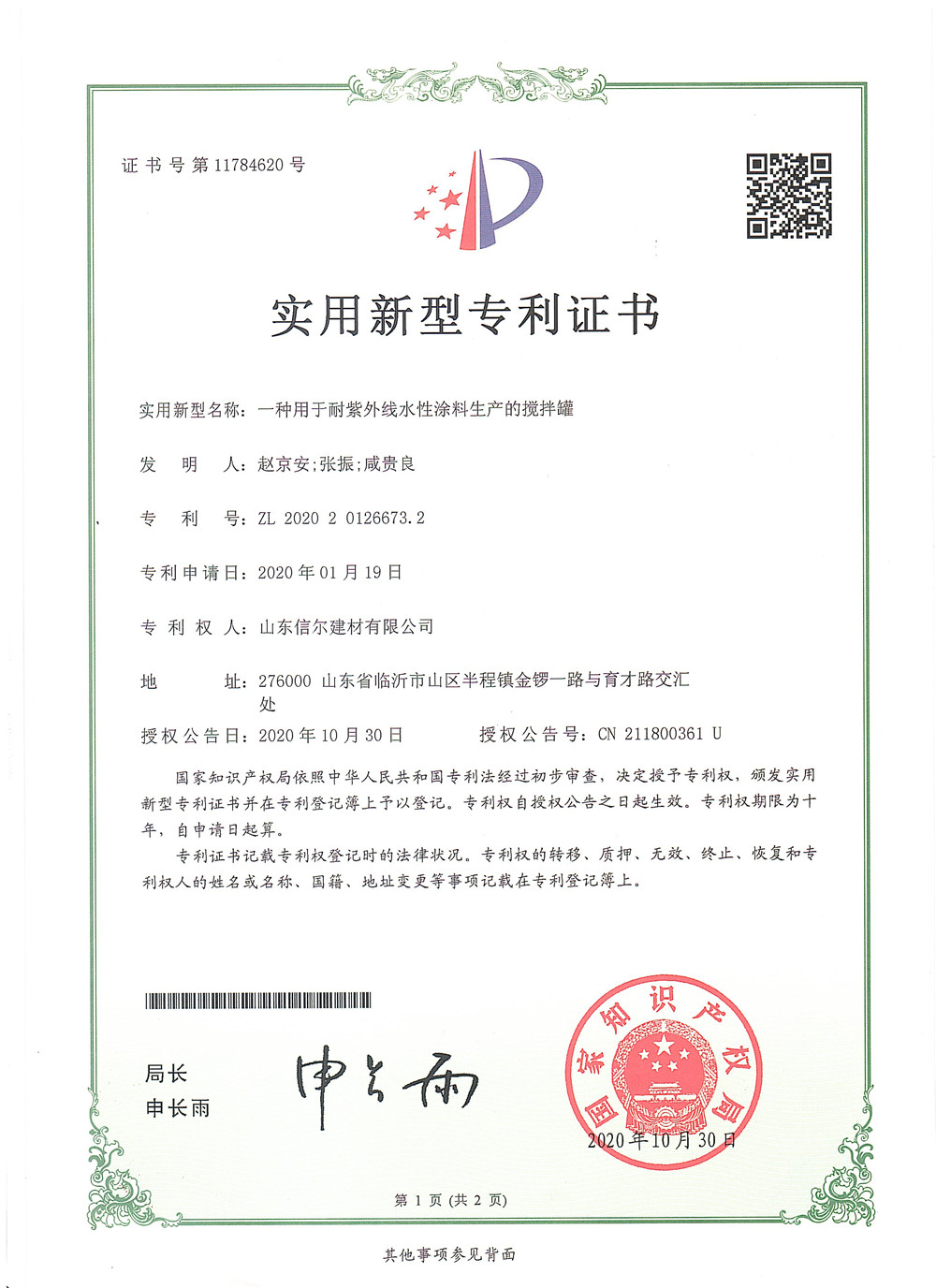 實(shí)用新型專利證書